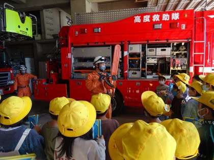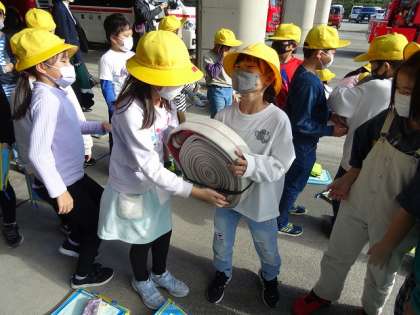 午後からは、富山市消防局を見学させていただきました。正面に並んだたくさんの消防車に驚きの声を上げていました。中でも高度救助隊の消防車では、特殊な機械を使って木材に穴を開けたり、金属のパイプを折り曲げたりする実演を見せていただきました。機械の音の大きさに思わず耳をふさぐ子が多く見られました。最後には、消防隊の方が火事の時に持って運ばれているホースを持たせていただきました。8kgもある重いホースを必死にかかえながら、消防隊の方々の大変さを感じていました。これから社会科の学習を通して、火事からくらしを守る人たちの仕事について考えていきましょう!
