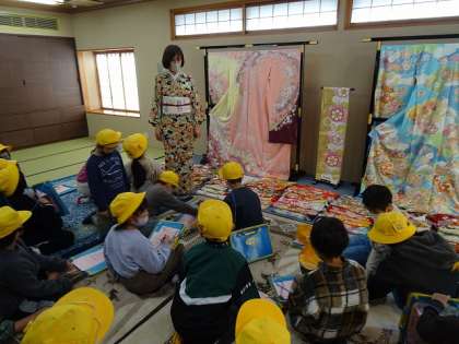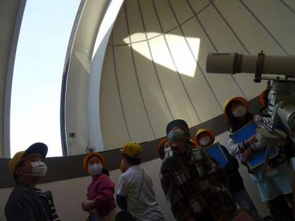 総合的な学習の時間には、「月岡のすてきマップを作ろう」月岡にある店について調べました。ブティック青木では、「着物屋さんなのにどうして天文台が?」と考えながら、店内に入りました。3階に上がって、ドームの扉が開くと、思わずオーと歓声をあげました。ちょうど月が出ており、みんなで天体望遠鏡で月を観察しました。その後、本業の着物を見せていただき、いつの時代にも変わらない着物の良さや、人生の節目で着る着物の大切さについて教えていただきました。ブティック青木のみなさん、とても美しい着物や分かりやい説明、子供たちのたくさんの質問に笑顔で答えていただきありがとうございました。