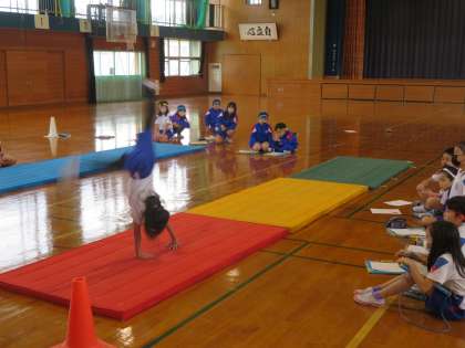 3年生 マット運動 公開日 2022/12/12 更新日 2022/12/12 第3学年 体育の授業では、マット運動をしています。子供たちは、きれいに技を決めることができたり、新しい技をできるようになったりすることを目標に、たくさん練習してきました。今日は、自分の得意な技やできるようになった技を、みんなの前で発表しました。練習の成果を発揮しようと、一生懸命頑張る子供たちです。