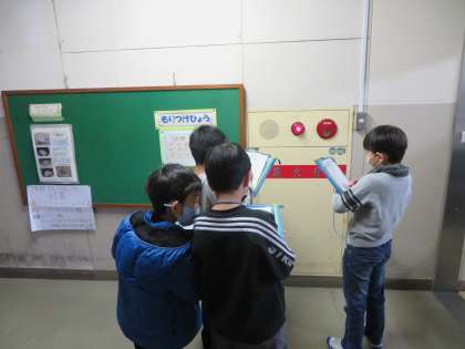 社会科の学習では、火事からくらしを守る人のはたらきとして消防士さんの工夫や苦労について学習しました。今日は、自分たちの学校を火事の被害から守るための設備について調べました。消火器や消火栓などが、とても多くあることに驚いていました。どんどん調べていく内に、火事が起こりやすい場所の近くに消火器が置いてあったり、消火栓はホースが届く範囲に必ず設置されていたりすることが分かりました。