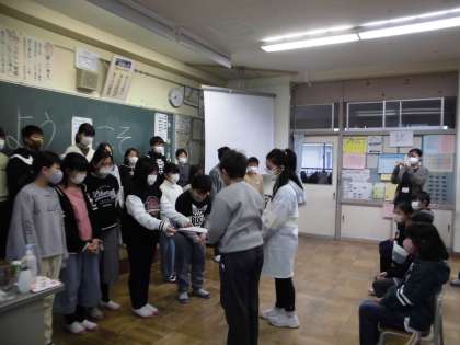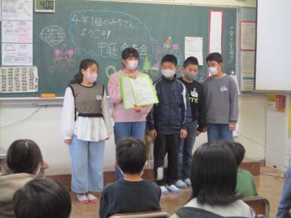 4月からこれまで、5年生が取り組んできた中庭の活動について、4年生に紹介しました。これまでのがんばりや託したいことが4年生に分かるように、伝え方を工夫していました。4年生のみんながよく聞き、感謝の思いを述べる姿から、5年生は紹介できたことへの達成感を味わっていました。