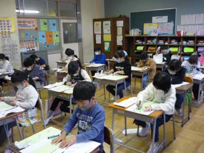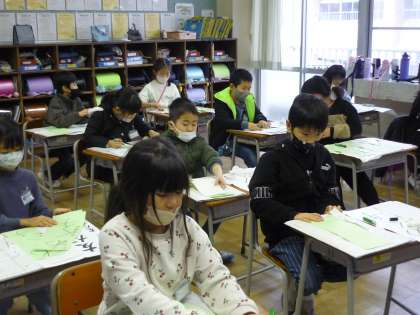 3学期がスタートしました! 公開日 2023/01/10 更新日 2023/01/10 第2学年 1月10日(火) いよいよ3学期がスタートしました。 写真上は始業式の様子です。月岡小Meetを利用してのオンラインでの参加でしたが、みんな3学期の決意を胸に、しっかりした態度で臨んでいました。 写真中・下は、書初大会の様子です。一画一画集中して書き、冬休みに一生懸命練習した成果を発揮しました。