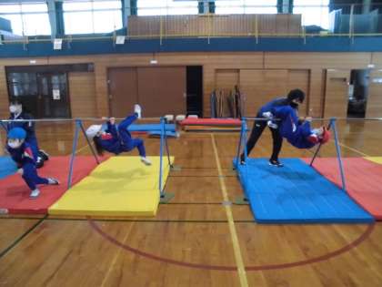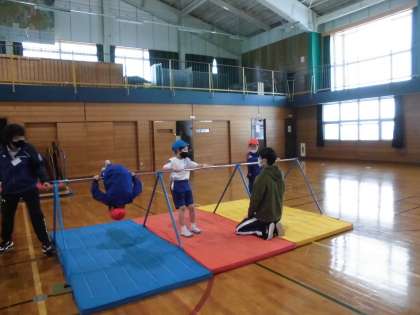 「ツバメ」や「ぶたのまるやき」等、支持したりぶら下がったりする技から前回り、逆上がりのコツを教えていただきました。「まだやりたかった!」、「回ることができたよ!」とうれしそうに話していた子供たちです。