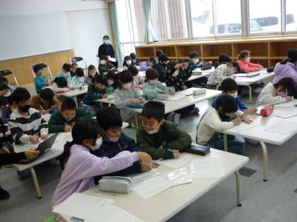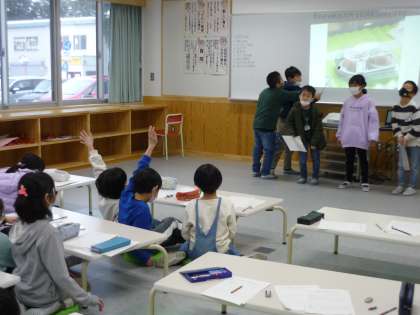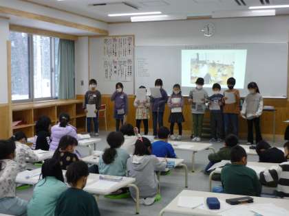 2学期に町探検に行き、お店や学校、お寺などを訪問し、そこで働いておられる方にお話を聞いたり、見学をしたりしながら、「月岡のステキ」について調べました。今日は、それぞれの場所で発見した、「月岡のステキ」を紹介し合う発表会をしました。声の大きさや話す速さを工夫したり、指示棒で写真を指しながら話したり、発表の中にクイズを取り入れたりなど、どのグループも聞いている人に「月岡のステキ」がしっかりと伝わるよう工夫をしていました。どのグループもたくさん練習したことが分かる発表会でした。