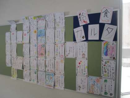 体育館に続く渡り廊下には、給食週間に当たり作成した給食かるたが掲示してあります。子供たちの給食に対する思いが表れているかるたです。