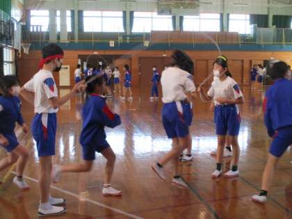 体育館では、6年生が長縄の8の字跳びに取り組んでいました。さすが6年生、跳ぶ人の列が、名前のとおり「8」の字に流れるように上手に跳んでいました。記録がどこまで伸びるか楽しみです。