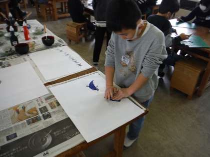 3年生 スタンプ版画 公開日 2023/02/06 更新日 2023/02/06 第3学年 図画工作科では、ゴム版画に挑戦しています。ゴム板に描いた絵を、彫刻刀で線彫りし、はさみで版を切り取りました。切り取った版にイメージに合う色を付けて、スタンプする数や向きを考えながら用紙に表しました。ゴム版をはがすときに、きれいな模様がうつっていると、とてもうれしそうな表情をしていました。