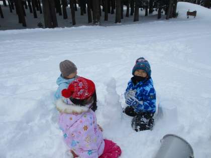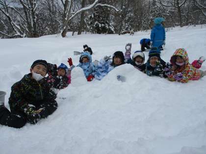 雪像活動では、バケツに雪を入れてひっくり返したり、シャベルで穴を掘ったりしていました。「おかしのおうち」やスロープを作り、楽しんだ1年生でした。
