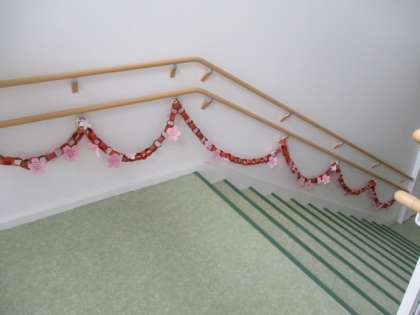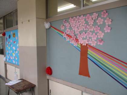 来週月曜日から始まる卒業を祝う週間に向け、学校の様々な場所に飾り付けが始まっています。写真は、全校児童が通る東階段に、5年生が輪飾りに6年生へのメッセージを書いた桜のカードを飾りつけた様子です。6年生教室前にも、メッセージカードでできた大きな桜の木ができています。