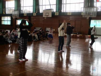 体育館では、3年生が、来週金曜日に行う卒業を祝う集会で、6年生に見てもらう出し物の練習をしていました。