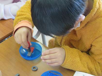 理科の学習では、磁石の不思議について調べています。今日は、磁石の極にはどんな性質があるのか調べました。子供たちは楽しんで実験に取り組みながら、さまざまな発見をしています。
