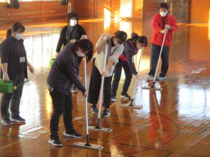 放課後には、2週間後に迫った卒業式に向け、教職員で体育館のワックスがけを行っている様子です。ワックスのむらが出ないようにモップに均等に力をかけ、塗布したところを踏まないようにと、慎重に行いました。