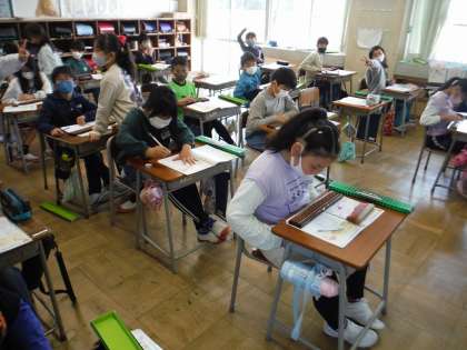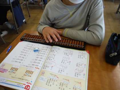 算数科の学習でそろばんを使いました。そろばんを使ったことがない子がほとんどで、「こんなジャラジャラで計算できるの?」と半信半疑でした。玉の入れ方や取り方を学習した後、簡単な計算をそろばんを使って解いてみました。始めは、玉の入れ方のきまりがなかなか理解できなかった子も、次第に慣れていき、素早く計算できるようになりました。中には「先生、暗算の方が早いのに・・・」とそろばんに苦戦している人もいました。昔の計算器にじっくりと体験し、計算の工夫について考えるよい機会となりました。