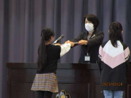 修了式では、各学級の代表児童に修了証を渡しました。ステージ上の代表の子供も、体育館フロアで整列する子供たちも皆真剣で、その立派な姿に1年間の成長を感じました。