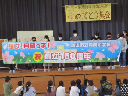 150周年を記念した横断幕を披露した際には、歓声が上がりました。これから1年間、玄関前に横断幕が掲示され、みんなの登校を出迎えます。月岡っ子がわくわくしながら登校する姿を楽しみにしています。