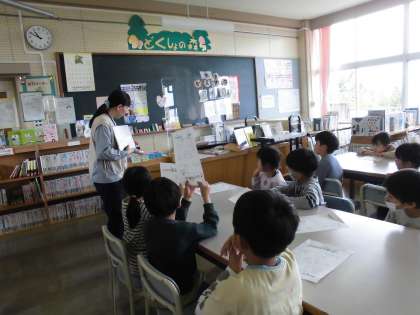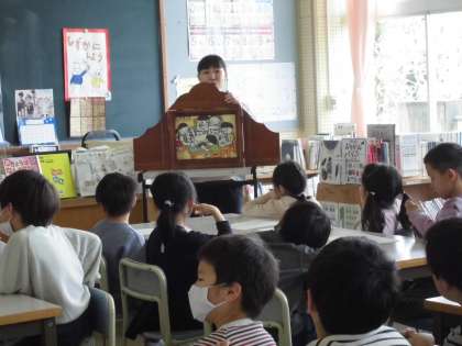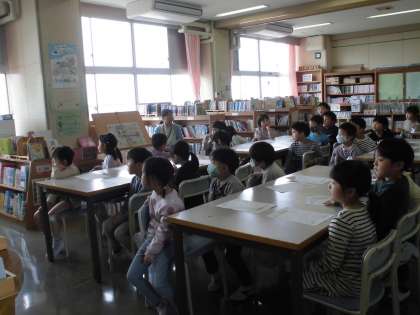 図書館オリエンテーションがありました!! 公開日 2023/04/24 更新日 2023/04/24 第1学年 4月24日(月) 読書の森で図書館オリエンテーションがありました。まず司書の先生から、図書室の使い方やマナーについて紙芝居を使って説明していただきました。その後、一人一冊ずつ本を借りました。これからどんどん読書の森を利用し、本をたくさん読んでほしいです。