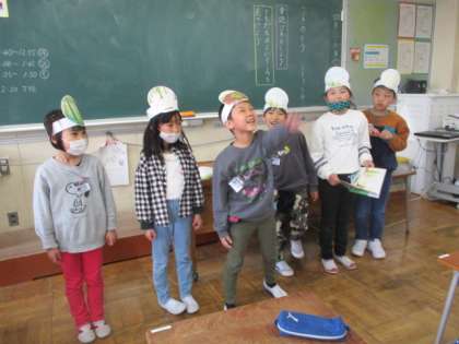国語科「ふきのとう」では、音読劇をしました。練習を重ね、気持ちを込めて台詞を言ったり、ふりを付けたりしながら音読をしました。すてきな劇に仕上がりました。