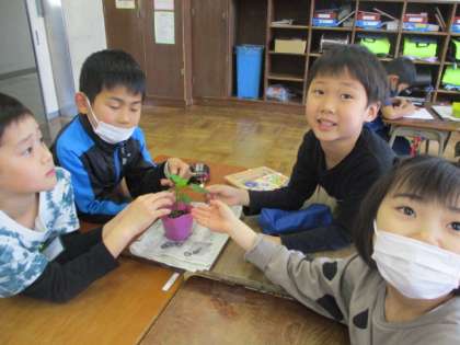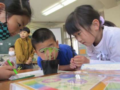 2年生 わたしたちのやさいばたけ 公開日 2023/05/09 更新日 2023/05/09 第2学年 生活科の学習で野菜を育てていく2年生です。 学年の畑では、ナス、オクラ、ピーマン、きゅうり、とうもろこしを育てます。今週いよいよ苗を植えますが、その前に苗を観察しました。「ここに毛があるよ」、「葉っぱを触ったら、ザラザラしている」と気付いたことを友達と伝え合っていました。