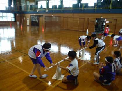 2週間後の運動会に向けて、中学年競技の練習がスタートしました。団体競技の「ビッグタイフーン」では、昨年の経験を生かして、少しでも速く走ったり回ったりするポイントを確認しました。色団のみんなに声をかけながら、みんなで上達しようとする様子が見られました。