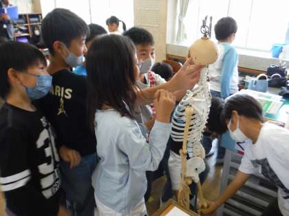 理科の学習では、人の体のつくりや動き方について学習しています。今日は、体を動かす仕組みについて、腕のモデルを使て骨と筋肉の動かし方について実験しました。さらに、腕以外の体の動かし方を調べるために、人体模型のアーサーくんを観察して、どんな動かし方をするのかを確かめました。授業が始まるまでは、「骸骨が不気味だ!」と警戒していた子供たちも、学習を終えた後は、自分の体と比べながら、「アーサーくんの〇〇の骨は太いなあ。」などと、人の体に興味をもつことができました。
