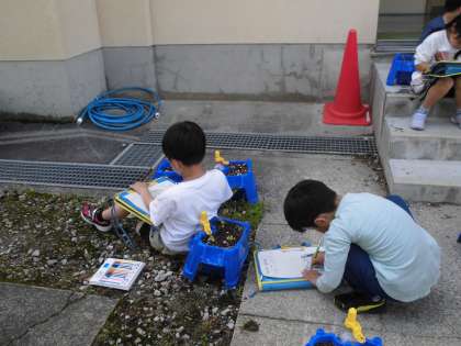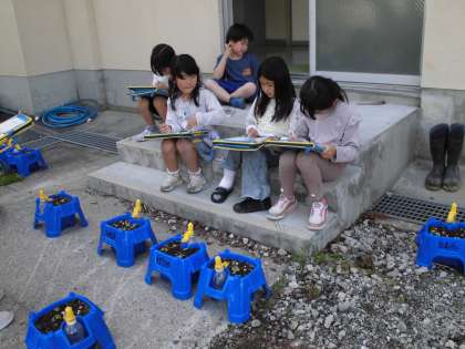 アアガオの芽が出ました!! 公開日 2023/05/31 更新日 2023/05/31 第1学年 5月30日(火) 今朝、「アサガオの芽が出てる!」と大喜びをする子供たちの声が・・・。アサガオを見に行ってみると、かわいい小さな芽が出ていました。さっそく、アサガオの様子を観察しにいきました。「朝、まだくるっと丸まっていた葉っぱが、もう開いているよ。」「芽の先っぽに種のからがついているよ。」「葉っぱはハートの形をしているね。」と、子供たちは、観察しながらたくさんの発見をしていました。
