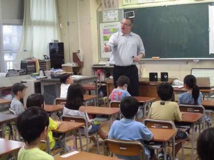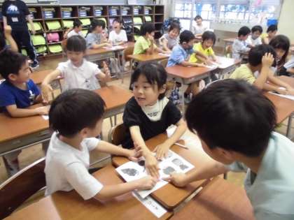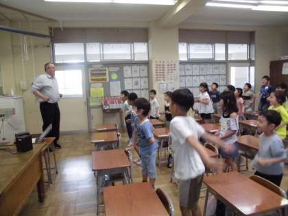 今日、外国語活動がありました。"I'm happy" や "I'm tired"、"I'm hungry" など、自分の気持ちの表し方をALTのリチャードの先生に教えてもらい、友達同士で言い合いっこをしました。子供達は、話す相手を見つけて積極的に自分の気持ちを相手に話していました。また、英語で果物の名前を英語でみんなで言い、その後リチャード先生が英語で話された果物を当てるゲームでは、リチャード先生は話された果物の名前をしっかりと聞き取り、果物の名前を当てることができました。小学校に入学して初めての外国語活動に、1年1組の子供達はみんな目を輝かせ、思いっきり外国語活動を思いっきり楽しんでいました。英語の曲のダンスをノリノリで踊る子供達の笑顔がとても印象的でした。