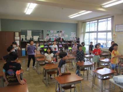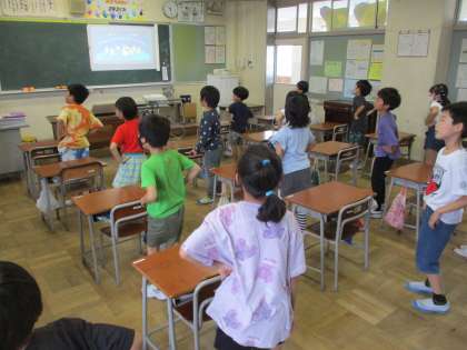 2組では、今日、外国語活動に取り組みました。I'm fine.など、体の調子を言う活動や、I like 〜.など、好きなフルーツを言う活動等を楽しみました。子供たちは、ダンスをするなど、体を動かしながら、外国語に親しみをもちました。