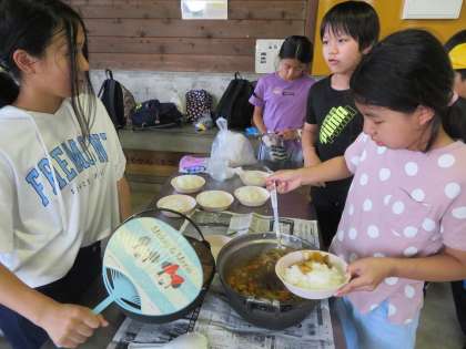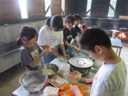 5年生 宿泊学習4 公開日 2023/07/03 更新日 2023/07/03 第5学年 野外炊飯の様子です。 みんなで協力してカレーをつくりました。 野菜の大きさや切り方を考えながら調理するカレー係、暑い中がんばって火を起こすかまど係、水の量に気を付けながらご飯をたくご飯係、それぞれが一生懸命がんばりました!