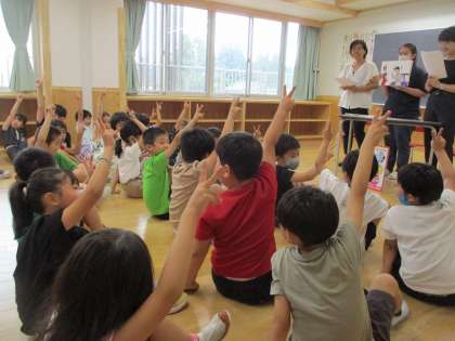育有会から「不審者対策」に関する紙芝居をしていただきました。具体的な場面を想定し、対応の仕方をクイズ形式にして進んでいきました。「いかのおすし」の合い言葉も確認しました。夏休みも安全に過ごせるように考えて行動できれば、と思います。