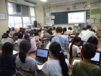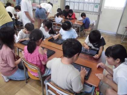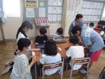 今週、1年生は、初めてクロムブックを使いました。最初の時間は、6年生さんに来てもらいマンツーマンでパスワードの入力のしかたを教えてもらいました。初めてのクロムブックにみんな怖々ドキドキでしたが、6人生さんがそばについてくださったので、無事パスワードを入力することができました。夏休みの宿題にもなっている、スマイルネクストにも取り組んでみました。スマイルネクストの課題に入るまでに悪戦苦闘しながらも、楽しく取り組むことができました。