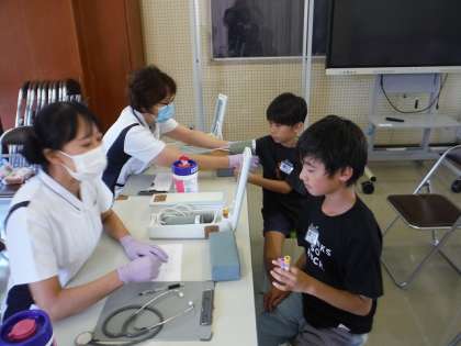 すこやか検診がありました。子供のうちから自分の体について知り、大人になってからの病気予防に努めるねらいがあります。実施項目は、腹囲と血圧、採血の検査でした。子供たちは、「俺、夏休みにちょっと食べ過ぎたかな?」とおなかをさわりながら話していたのが大人の健康診断と同じで微笑ましかったです。採血については、朝から心配している子供が多く、採血が終わった友達に「痛かった?」と確かめていました。バランスよく食べて、よく運動・勉強をして、早寝早起きをしていこうと、ふり返っていました。