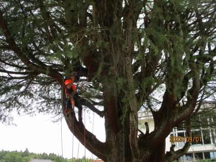 学校のシンボルツリーでは、今朝から剪定を行っていただきました。アーボリニストとよばれる、木の樹護師の方に来ていただき、その仕事について、詳しく話を聞かせていただきました。また、学校のシンボルツリーも生き返ったように、太陽の光を浴びて輝いているようです。