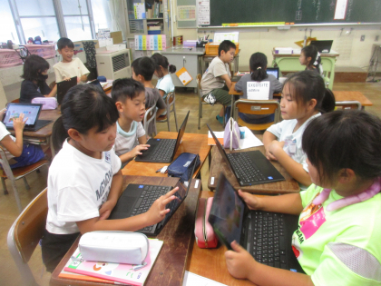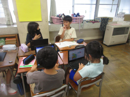 国語科の学習では、「山小屋で三日間過ごすなら、何を持っていくか」について、クロムブックのジャムボードを使いながら、グループで話し合いをしました。