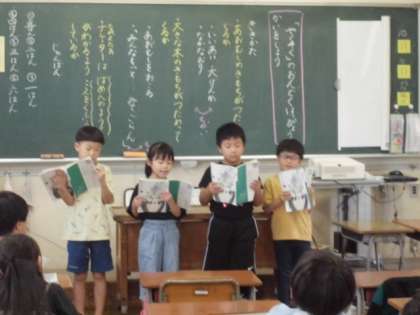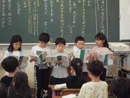 国語の時間に「やくそく」音読発表会しました。場面の様子や登場人物の気持ちを思い浮かべながら、声の大きさや読む速さなどを工夫しながら音読をしました。それぞれのグループの音読がおわるたびに、「あおむしたちのけんかをしている様子が伝わってきてよかった。」、「『それなら、みんなでいこう。』の言葉を大きな声で読んでいたのであおむしたちの約束が伝わってきた。」などの感想が活発に出てきました。