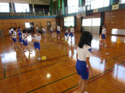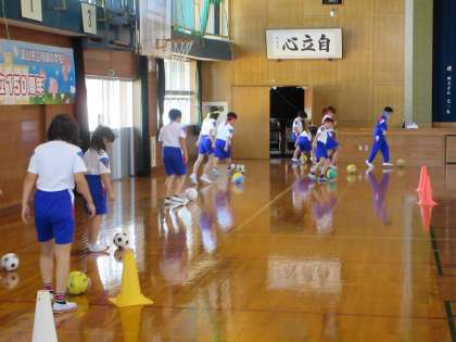 体育科の学習では、サッカーをしています。ドリブルの仕方やボールの蹴り方など、基本的な動きから学び、最後にはお試しの試合をしてみました。サッカーは未経験の児童が多くいましたが、難しさを感じながらも頑張って活動に取り組んでいました。