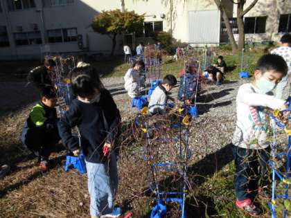 木曜日は、今まで育てていた朝顔のつるを植木鉢からはずし、リースの輪をつくりました。来週には、校外学習の時にファミリーパークで拾ったどんぐりや落ち葉などの秋に自然物や、家からもってきた材料を使って、リースの輪に飾り付けをします。