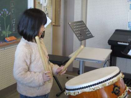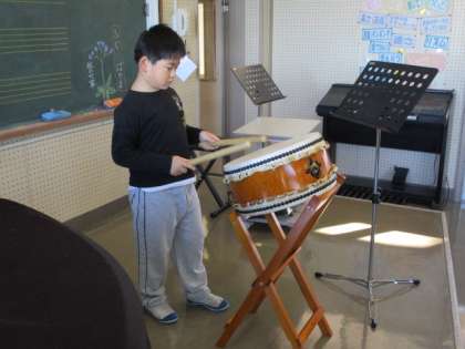 音楽の学習で、「おまつりの音楽」をつくり、発表しました。初めて体験する和太鼓に緊張気味の子供たちでしたが、練習を重ねたので、力強く打っていました。「本当のお祭りのようで楽しそう」という感想がたくさんでました。