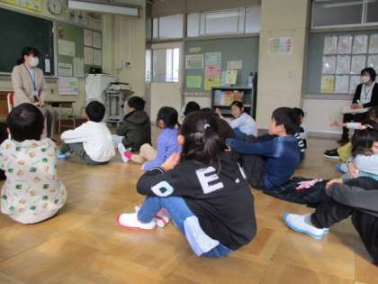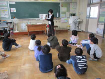 富山市立図書館月岡分館の司書の方々が訪問してくださりました。司書の方の素話を聞いて想像を膨らませたり、読み聞かせを通して物語の世界に入り込んだりするなど、子供たちは本に親しみをもちました。図書館からのおすすめの本を何冊か借りることができ、子供たちは1冊1冊読むことを楽しみに順番を待っています。