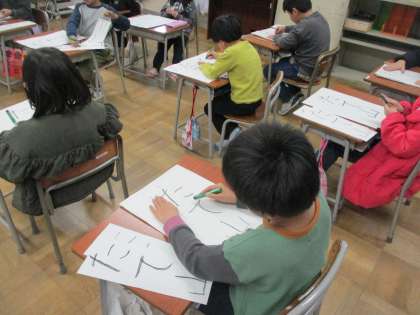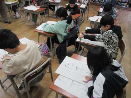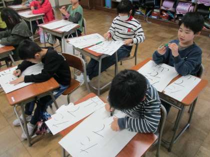 子供たちは書写の学習で、書初大会の練習をしました。今年度の2年生の字は「たて山」です。字の大きさや濃さに気をつけながら、真剣に丁寧に取り組みました。