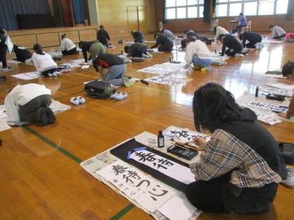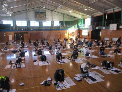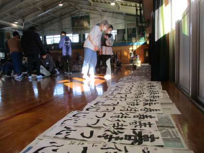 5・6年生 書き初め大会 公開日 2024/01/10 更新日 2024/01/10 第6学年 5・6年生は体育館で大会に参加しました。1年の始まりにふさわしい真剣な態度で取り組みました。友達同士で、お互いのよさや努力を認め合う姿も見られました。 3学期は、6年生は自分の力を伸ばすだけでなく、最高学年としての思いや取組を5年生に伝えること、5年生はそれを引き継ぎ、最高学年への心構えをもつことを期待しています。2024年の3学期もよろしくお願いします。