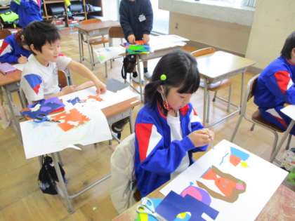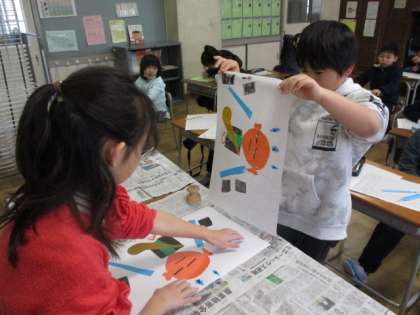 図画工作の学習で、紙版画をしました。色紙で版を作り、水に浸した紙で写し取ります。色紙からその色が染み出てきて、子供たちも「わぁー」と声を上げていました。