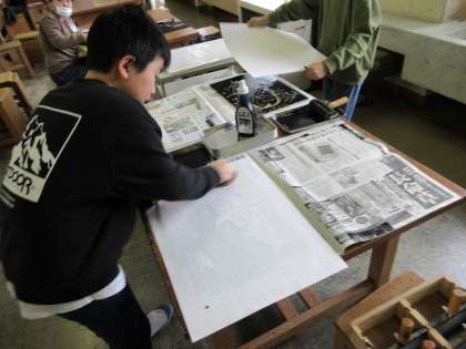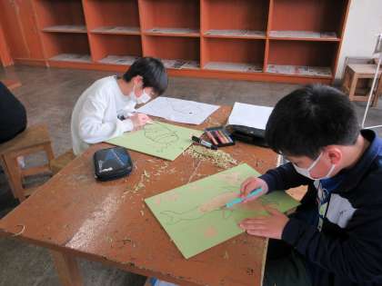 図画工作科の時間には、版画に取り組んでいます。生き物の動きを版木に写し取った後、彫刻刀を使って彫り進めました。白と黒のバランスや色を付ける部分を考えながら、取り組んでいます。ある程度彫り終わった子供たちは、インクをつけて、バレンに力を込めて仕上がりを確認しました。