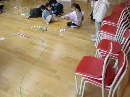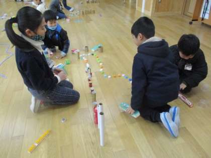 ならべて ならべて 公開日 2024/02/06 更新日 2024/02/06 第2学年 図画工作科の時間に、いろいろなものを並べて、いろんな形を見付ける学習をしました。筒や電池、ペットボトルキャップ、数え棒などを友達と協力して並べました。そこから「蛇に見える」や「ジェットコースターみたい」と見えた形について伝え合っていました。