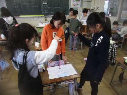 理科では、これまで学んだことを使っておもちゃをつくる学習をしました。子供たちは、ゴムや電気、じしゃくの性質を使って工夫しておもちゃをつくっていました。自分がつくった物について発表した後、みんなで遊びました。子供たちは、みんな楽しく活動することができました。