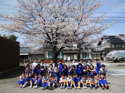 写真左 桜の木の下で集合写真を撮りました。