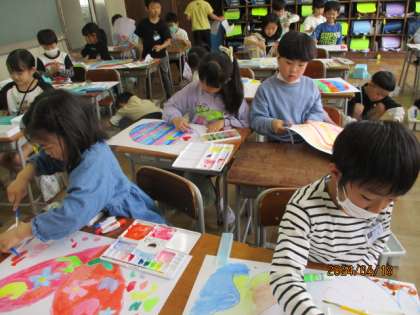 写真右 図画工作「ふしぎなたまご」のたまごを描いています