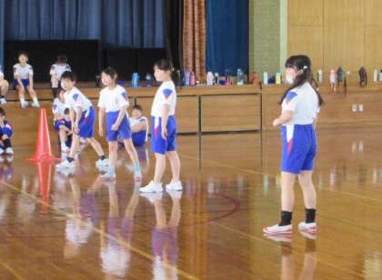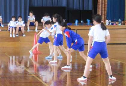 体育科の学習で、走る運動に取り組んでいます。「ねことねずみ」で楽しくウォーミングアップした後、みんなでリレーをしました。4年生の子供たちは、全力で運動に取り組んでいました。