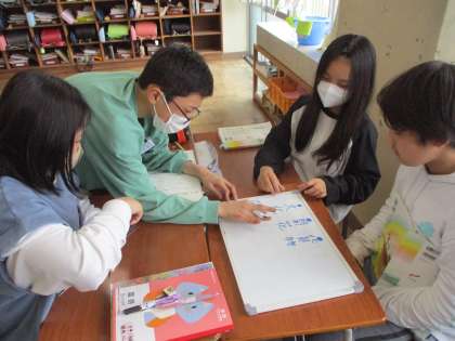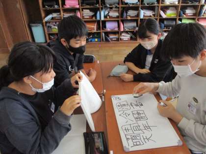 国語科の学習の様子です。グループで力を合わせて、同じ音、同じ部分をもつ漢字クイズにチャレンジしています。