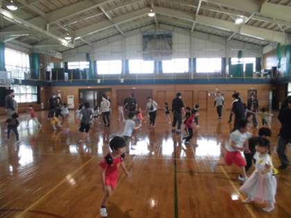 1年生 親子活動 公開日 2024/05/12 更新日 2024/05/12 第1学年 1年生の親子が集まり、ゲームを楽しむ活動がありました。「かもつれっしゃ」や「タグ取り合戦」「風船運びリレー」をしました。親子で対決したり、協力したりしながら、親も子も元気に動き回りました。「楽しかった!」と笑顔いっぱいの1年生でした。
