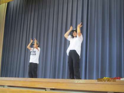 6年生 全校集会がありました! 公開日 2024/05/24 更新日 2024/05/24 第6学年 自分たちの得意なことを披露する「自慢大会」が全校でありました。6年生は、ダンスチーム、バスケチーム、お笑いチームの3チームが出場しました。子供たちは、今日のために練習を重ね、全校の前で堂々とパフォーマンスを披露することができました。子供たちは「出てよかった」と言っており、とても満足した自慢大会になったようです。